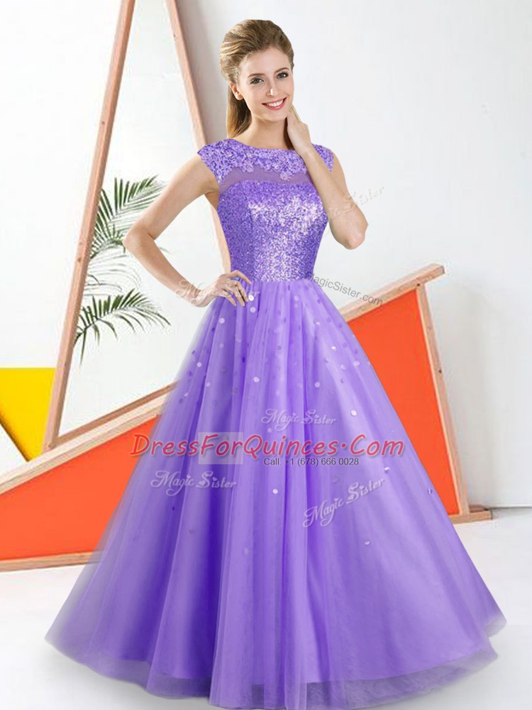 Delicate Bateau Sleeveless Backless Damas Dress Lavender Tulle