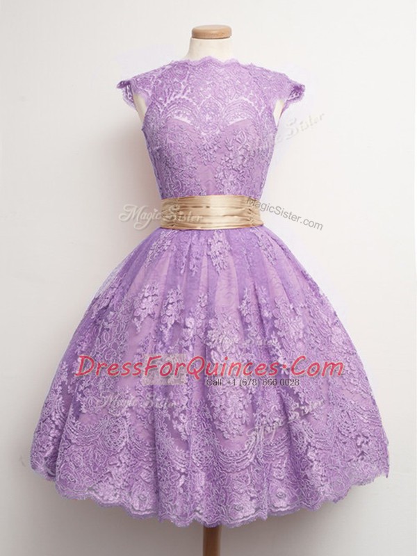 Free and Easy Lace High-neck Cap Sleeves Lace Up Belt Court Dresses for Sweet 16 in Lavender