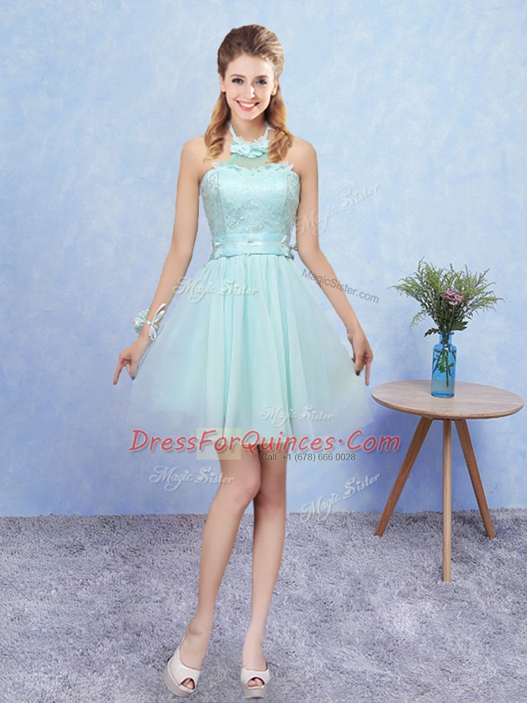 Glorious Aqua Blue Halter Top Neckline Lace Damas Dress Sleeveless Lace Up