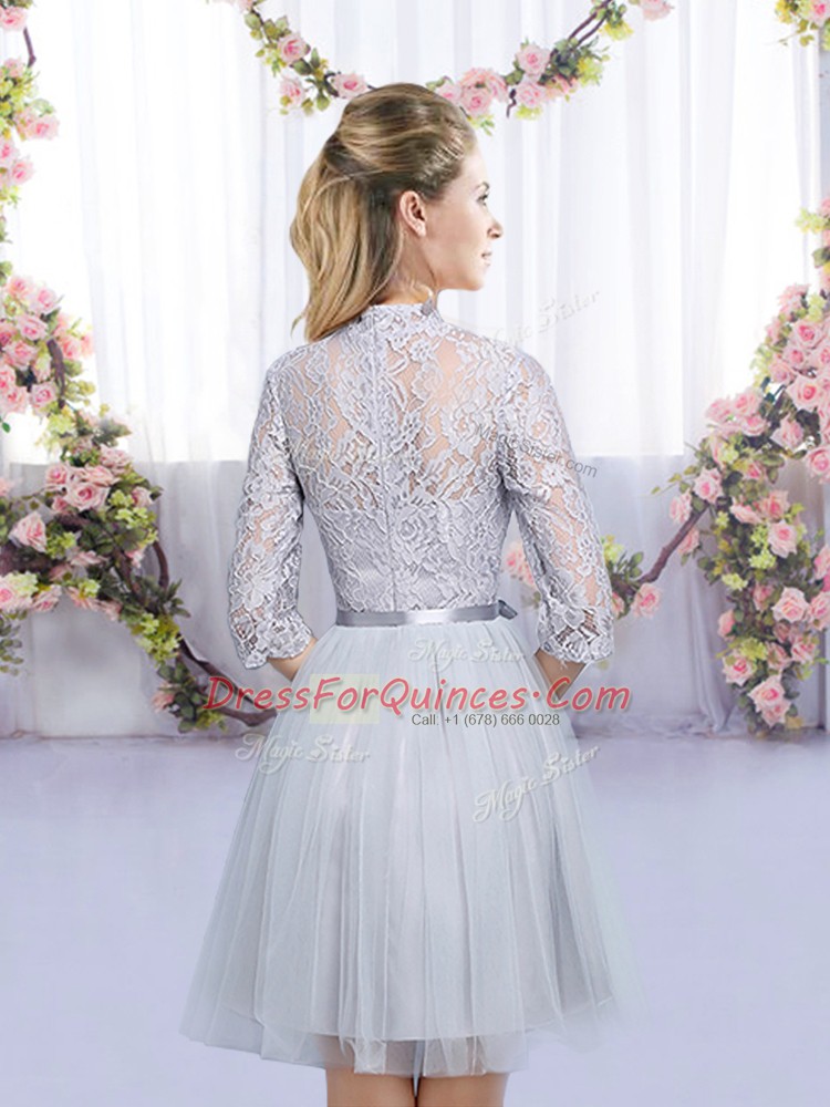 Grey High-neck Neckline Lace and Belt Quinceanera Dama Dress Half Sleeves Zipper