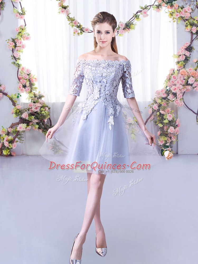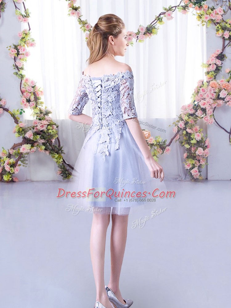 Half Sleeves Tulle Mini Length Lace Up Quinceanera Dama Dress in Grey with Lace