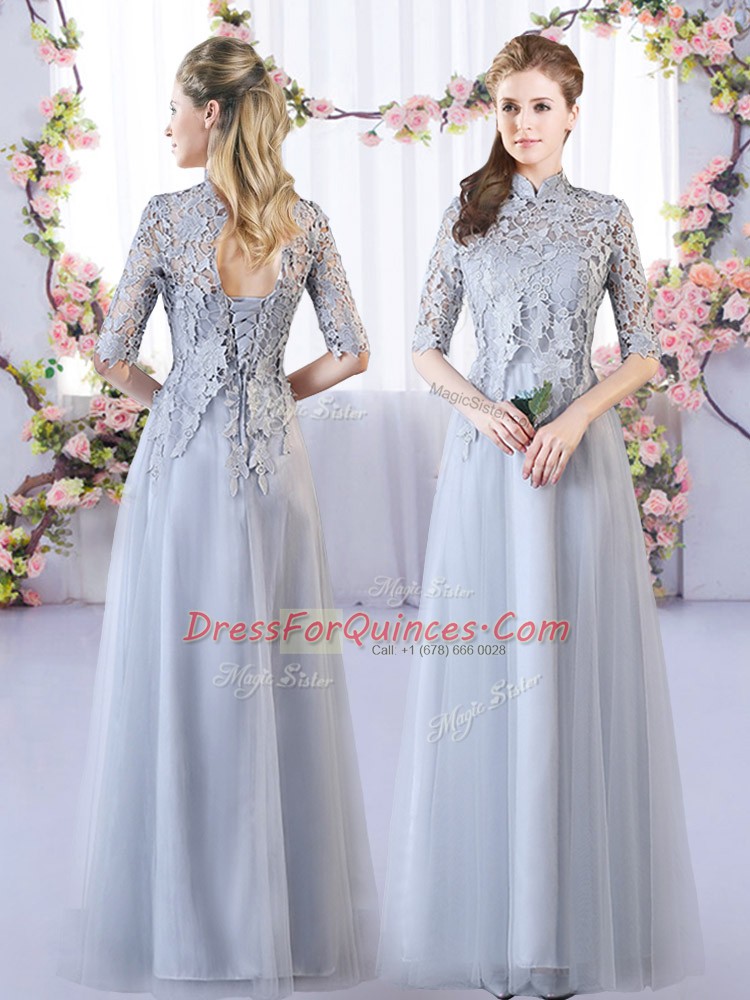High End Tulle High-neck Half Sleeves Lace Up Lace Dama Dress for Quinceanera in Grey
