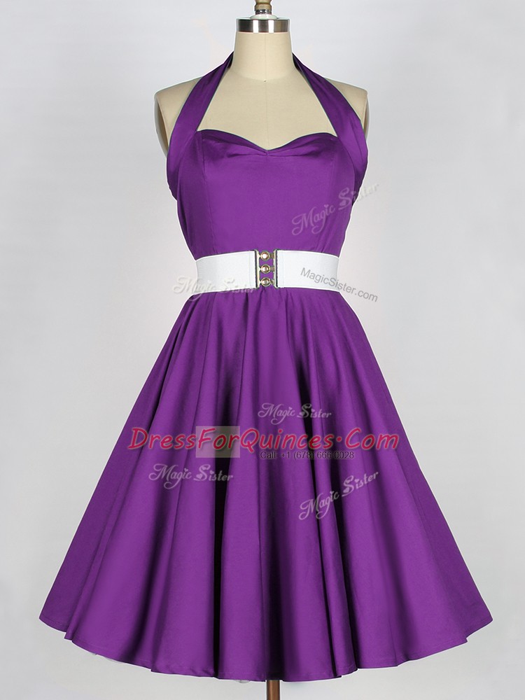 Modern Taffeta Halter Top Sleeveless Lace Up Belt Court Dresses for Sweet 16 in Eggplant Purple