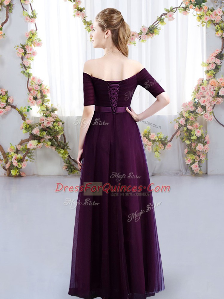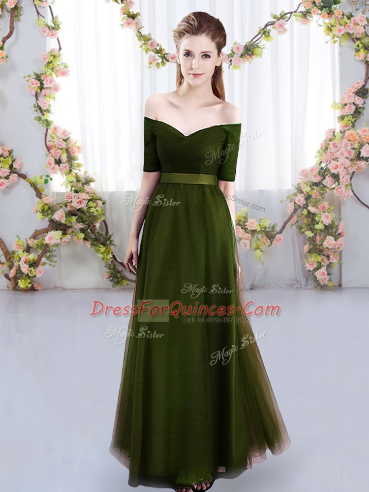 Olive Green Empire Off The Shoulder Short Sleeves Tulle Floor Length Lace Up Ruching Court Dresses for Sweet 16