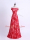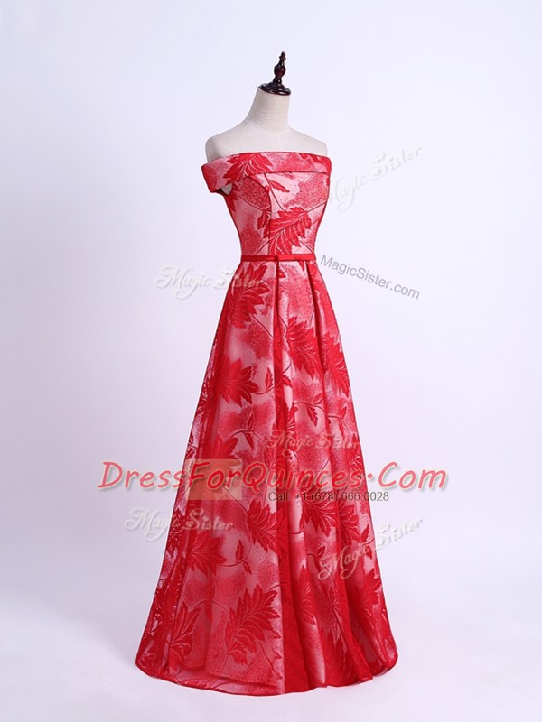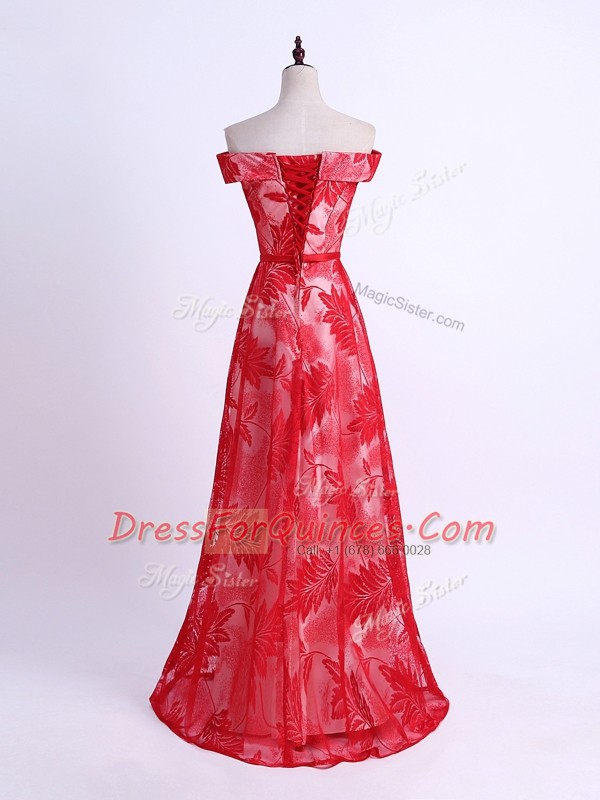 On Sale Floor Length Red Quinceanera Court of Honor Dress Off The Shoulder Sleeveless Lace Up