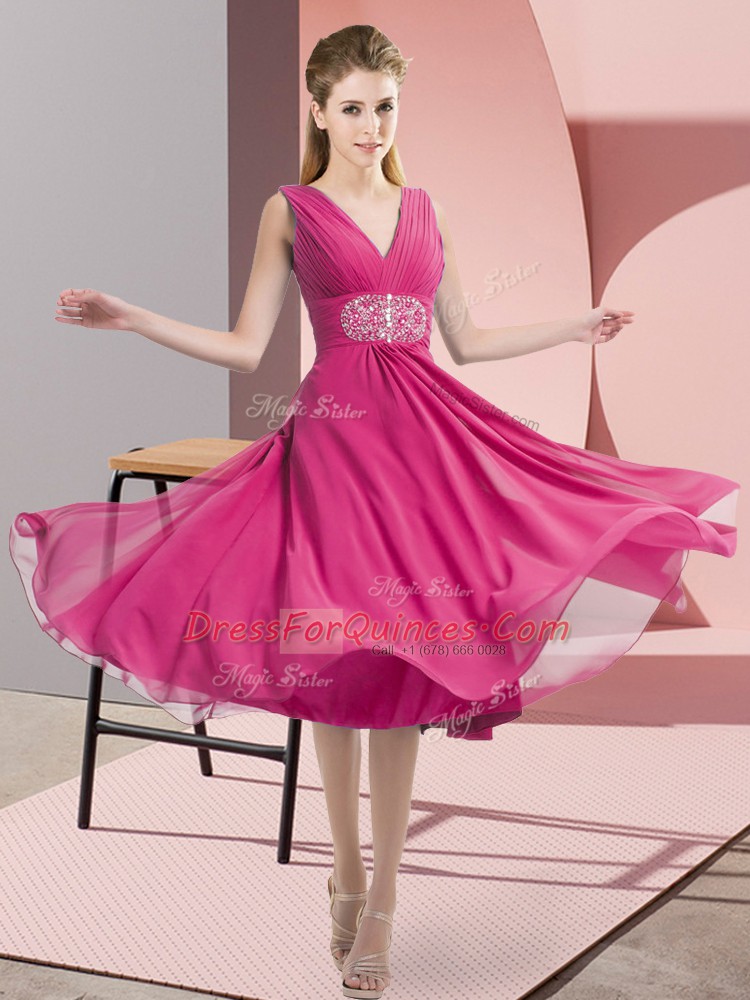 Pretty Knee Length Side Zipper Dama Dress for Quinceanera Hot Pink for Prom and Party and Wedding Party with Beading