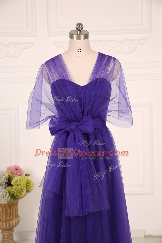 Super Purple Empire Tulle Straps Sleeveless Ruching Floor Length Zipper Vestidos de Damas