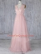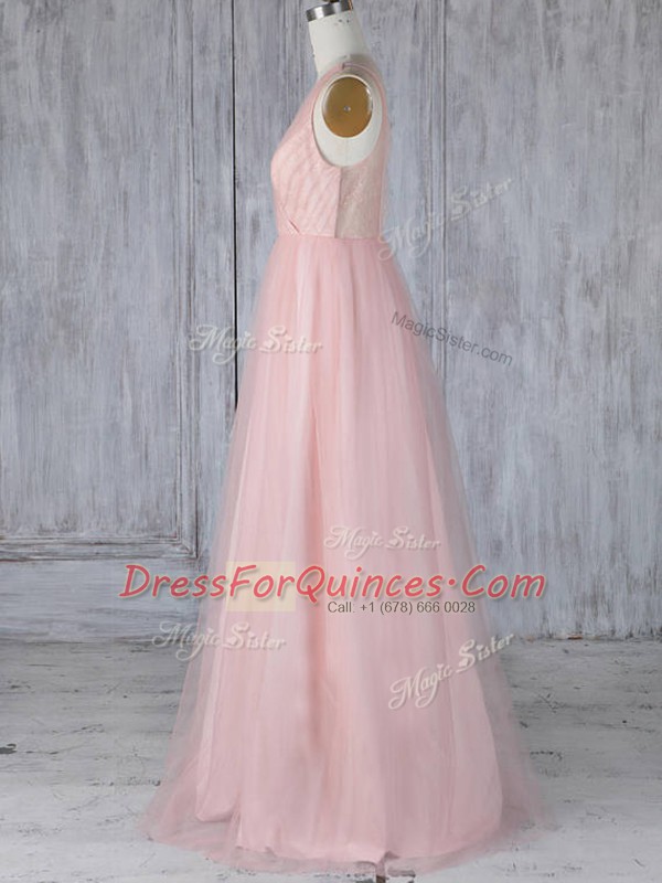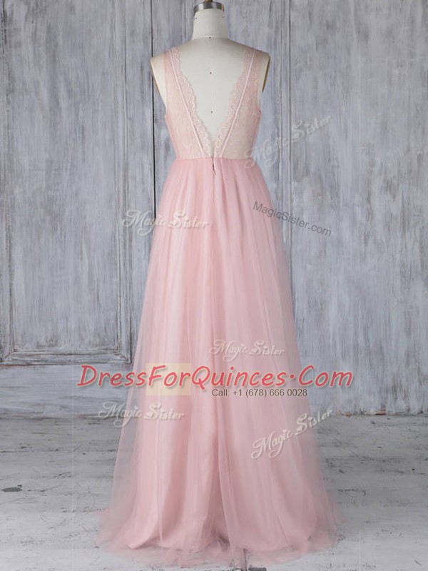Super V-neck Sleeveless Court Dresses for Sweet 16 Floor Length Lace Baby Pink Tulle