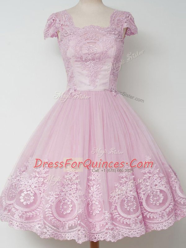 Traditional Lilac Square Neckline Lace Quinceanera Court Dresses Cap Sleeves Zipper