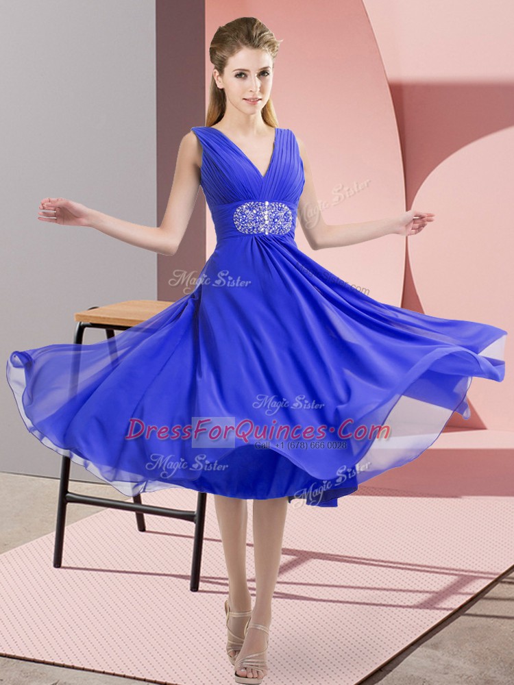 Unique Blue V-neck Side Zipper Beading Dama Dress Sleeveless