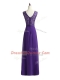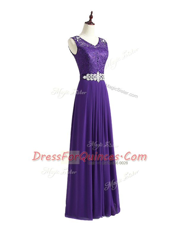 Unique Lavender Empire Chiffon V-neck Sleeveless Beading and Lace Floor Length Zipper Dama Dress for Quinceanera