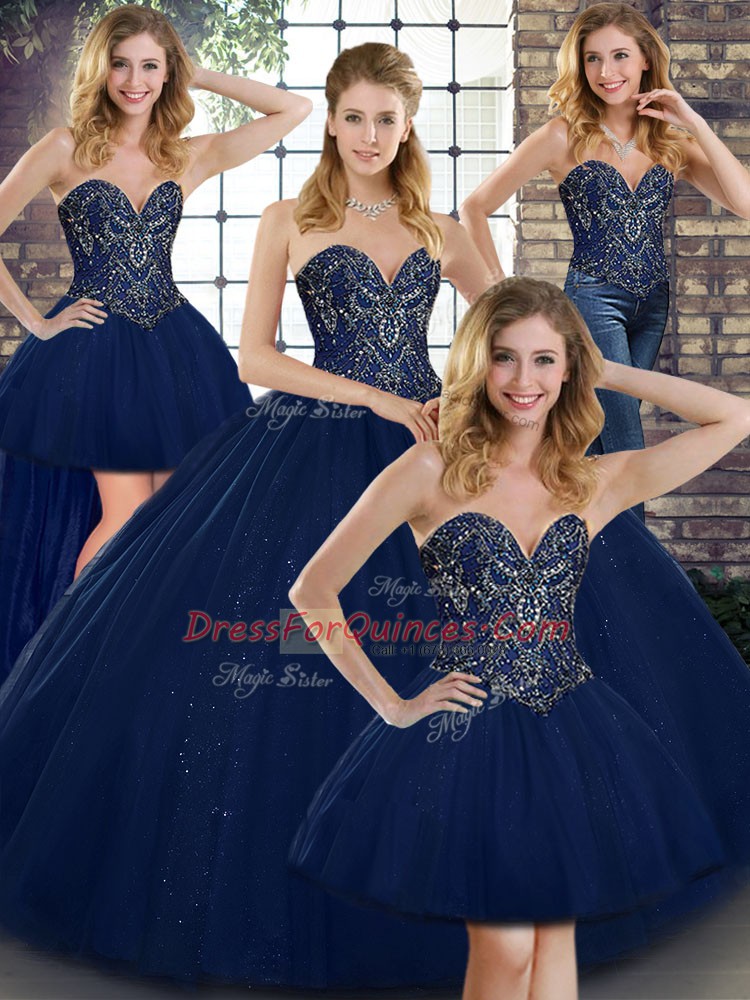 Best Selling Navy Blue Sleeveless Floor Length Beading Lace Up Vestidos de Quinceanera