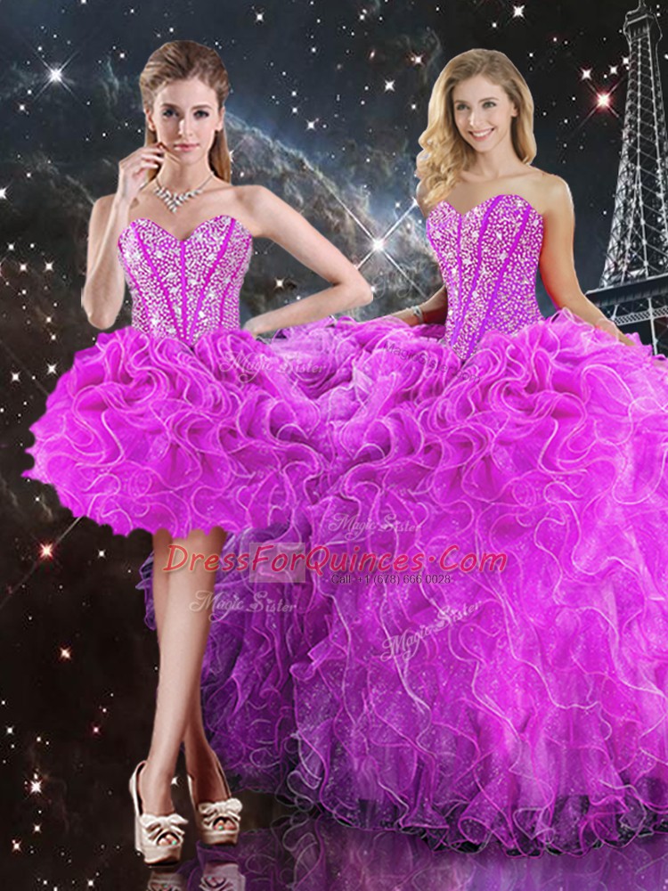 Cheap Organza Sweetheart Sleeveless Lace Up Beading and Ruffles Quinceanera Gown in Fuchsia