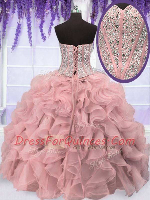 Comfortable Four Piece Sequins Floor Length Ball Gowns Sleeveless Pink Quinceanera Dress Lace Up
