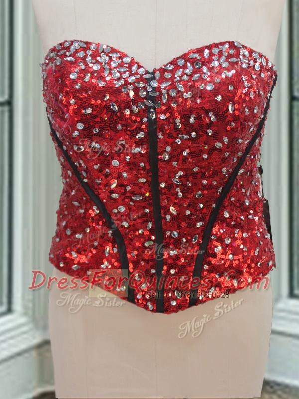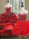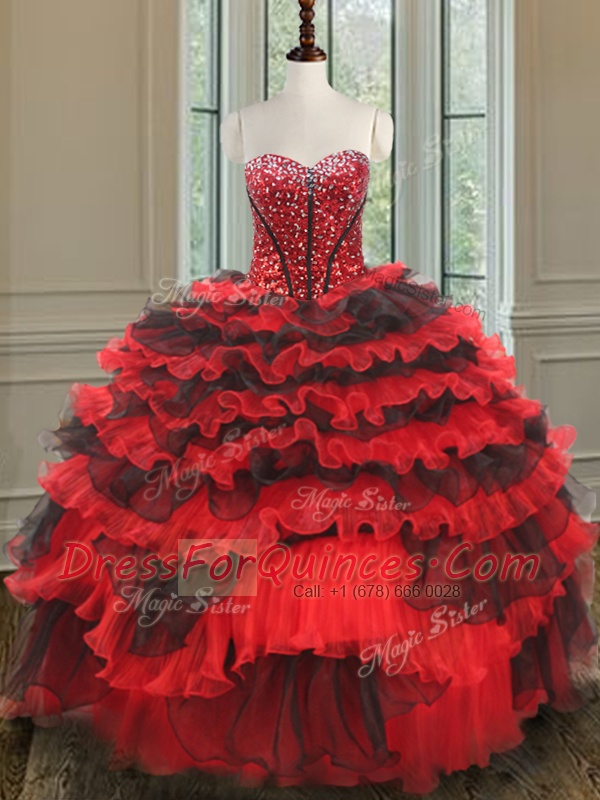 Custom Design Three Piece Sleeveless Organza Floor Length Lace Up Quinceanera Dress in Black and Red with Beading and Ruffled Layers