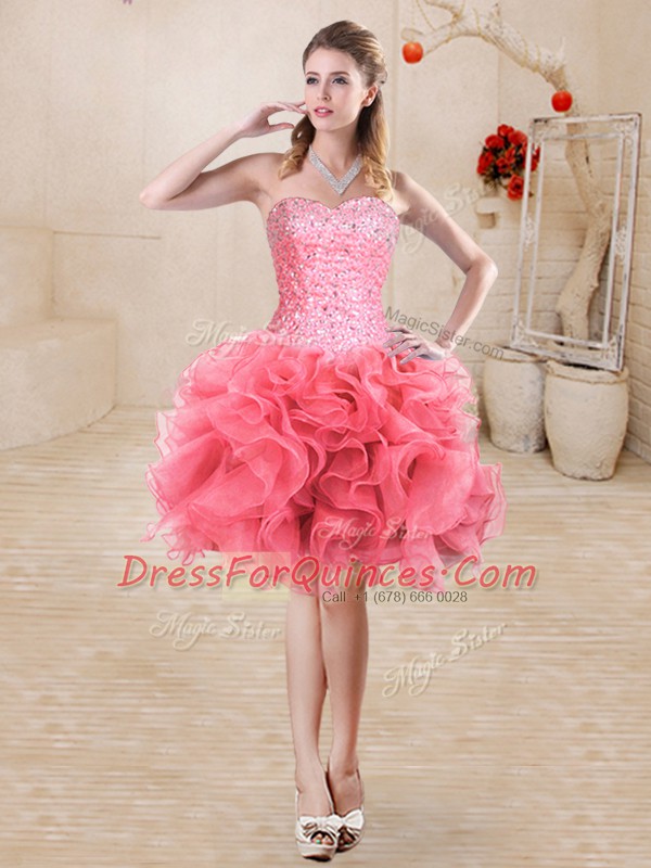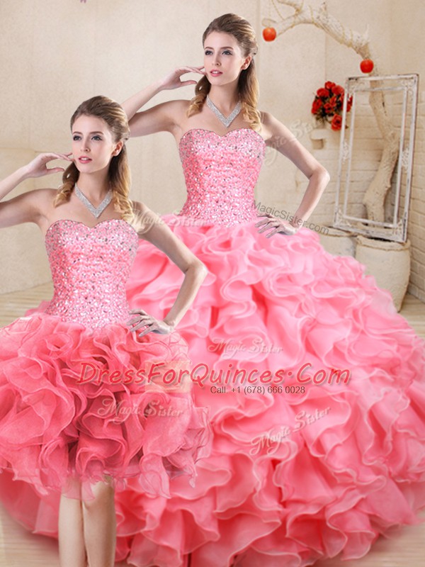Custom Designed Watermelon Red Ball Gowns Beading and Ruffles Sweet 16 Dresses Lace Up Organza Sleeveless Floor Length