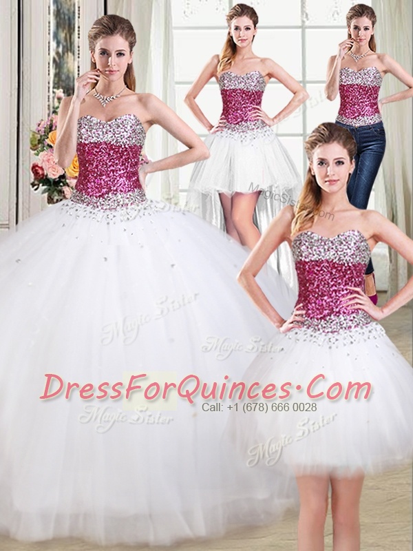 Cute Four Piece White Lace Up Sweetheart Beading Quinceanera Gowns Tulle Sleeveless
