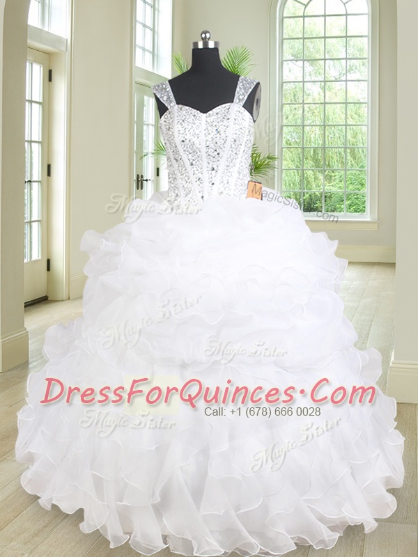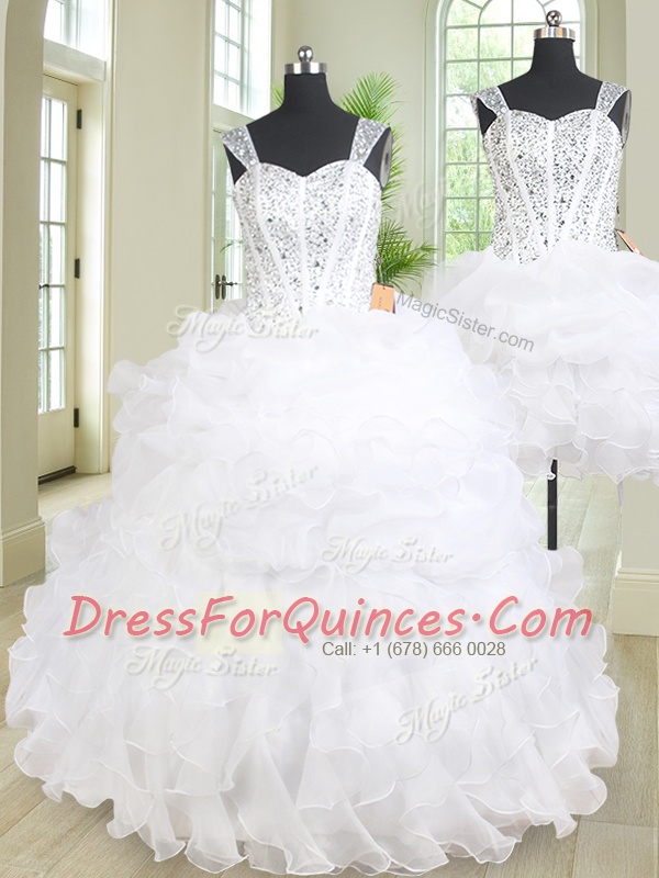 Dramatic Three Piece Straps Sleeveless Sweet 16 Dresses Floor Length Beading and Ruffles White Organza