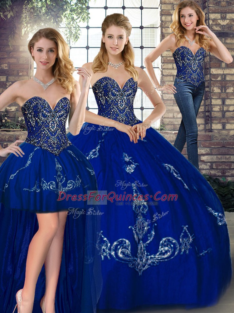 Dynamic Royal Blue Three Pieces Beading and Embroidery 15 Quinceanera Dress Lace Up Tulle Sleeveless Floor Length