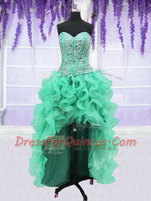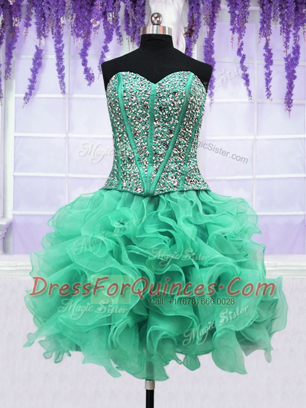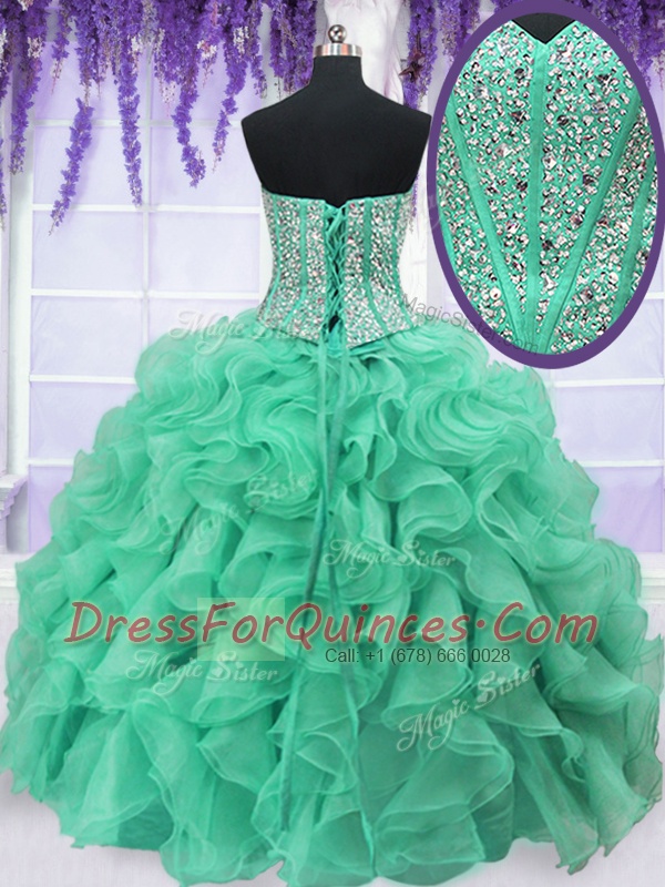 Edgy Four Piece Turquoise Ball Gowns Ruffles and Sequins 15 Quinceanera Dress Lace Up Organza Sleeveless Floor Length