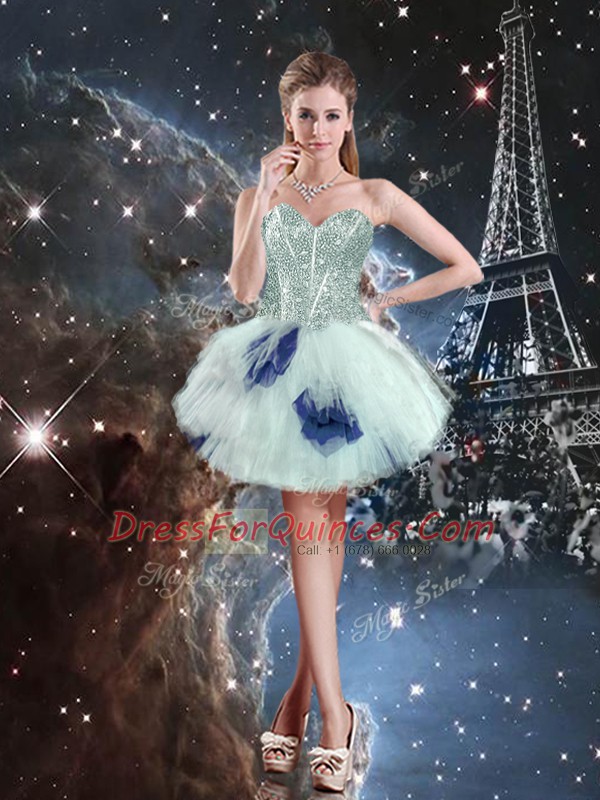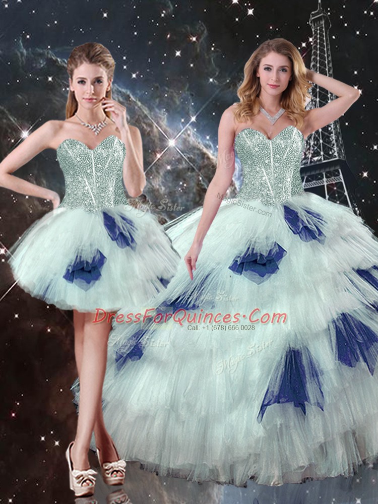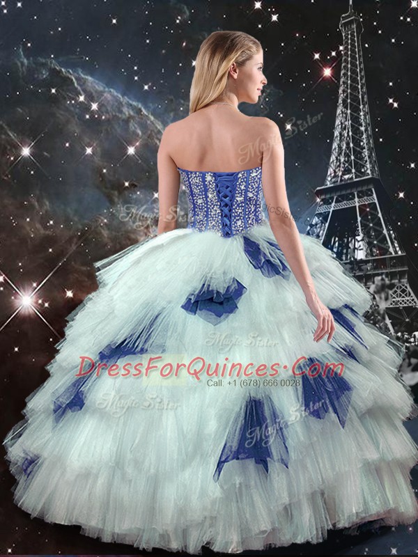 Elegant Tulle Sweetheart Sleeveless Lace Up Beading and Ruffled Layers and Sequins Quinceanera Gown in Blue And White