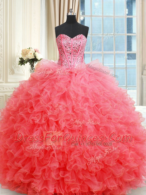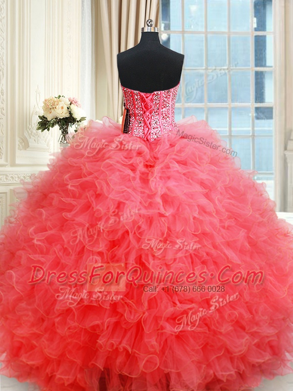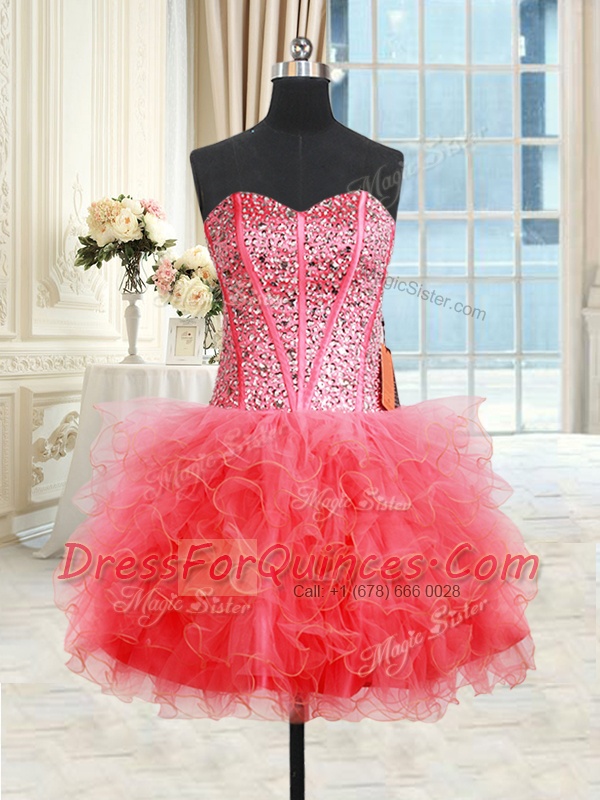 Fashion Three Piece Coral Red Sweetheart Lace Up Beading and Ruffles 15th Birthday Dress Sleeveless