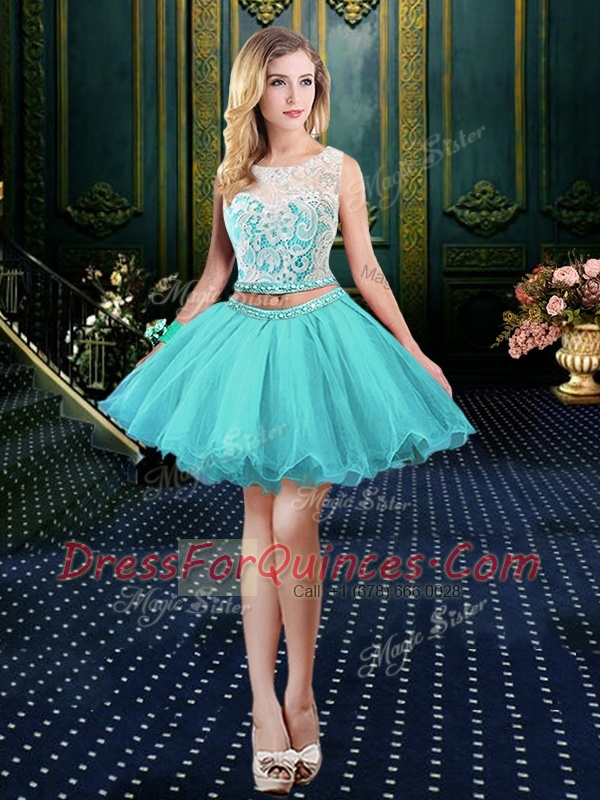 Flare Three Piece Scoop Floor Length Blue Quinceanera Dresses Tulle and Sequined Sleeveless Lace and Sequins
