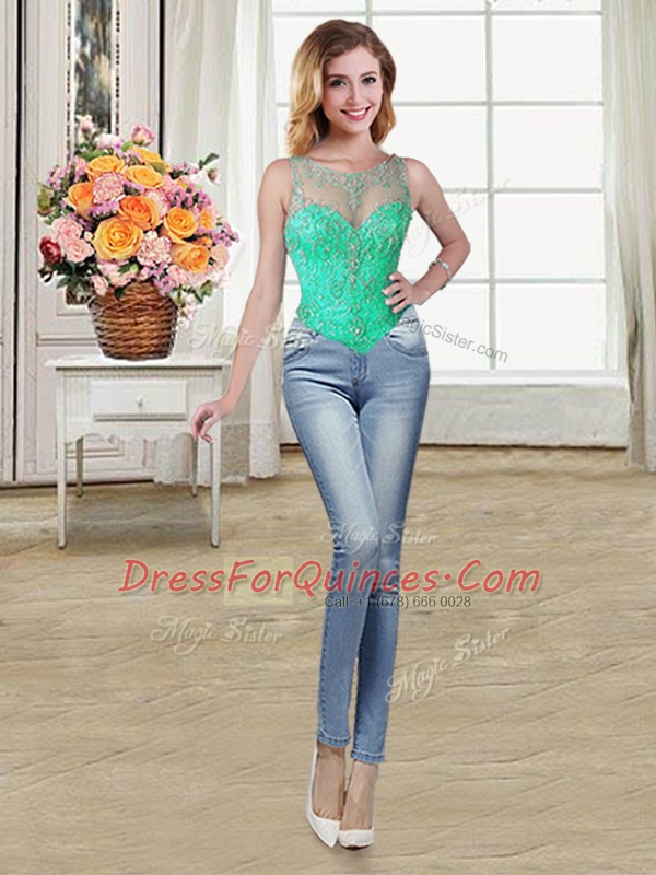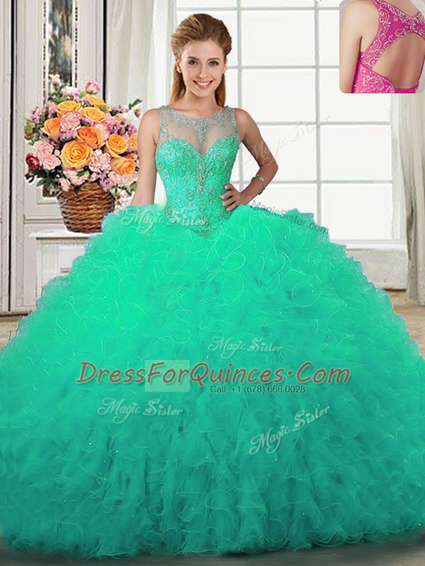 Four Piece Scoop Sleeveless Tulle Floor Length Lace Up Sweet 16 Quinceanera Dress in Turquoise with Beading and Ruffles