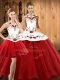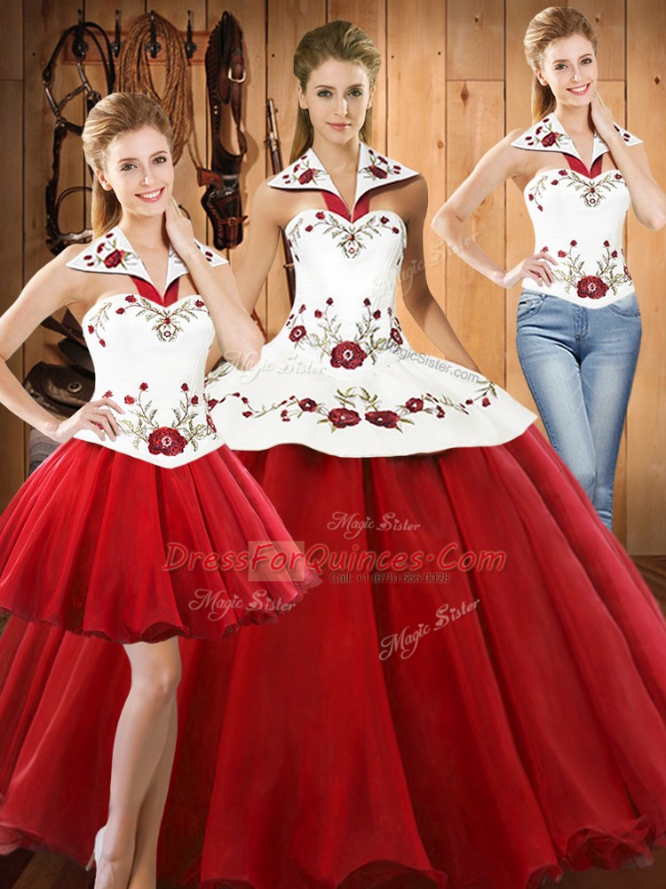 High End Wine Red Satin and Tulle Lace Up Halter Top Sleeveless Floor Length Sweet 16 Dresses Embroidery