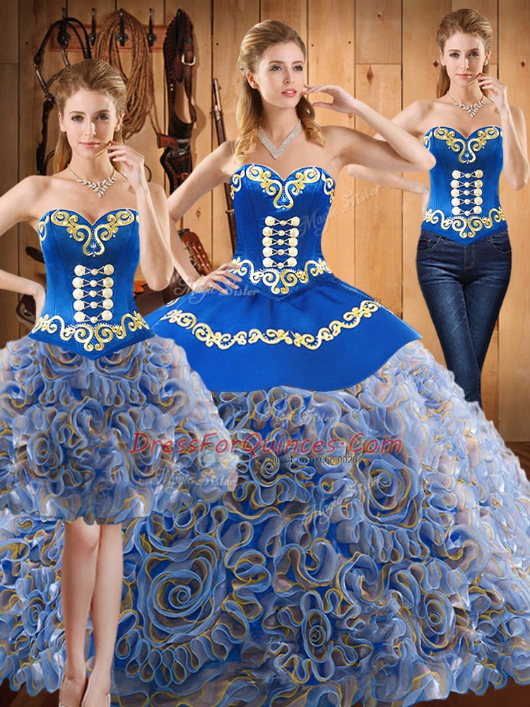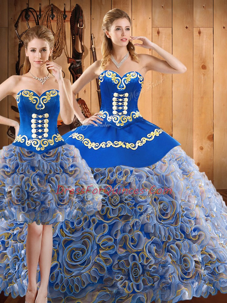 Multi-color Three Pieces Sweetheart Sleeveless Satin and Fabric With Rolling Flowers With Train Sweep Train Lace Up Embroidery Vestidos de Quinceanera