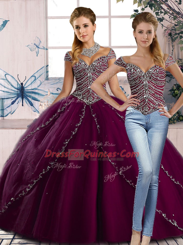 New Arrival Purple Ball Gowns Beading Quinceanera Dress Lace Up Tulle Cap Sleeves