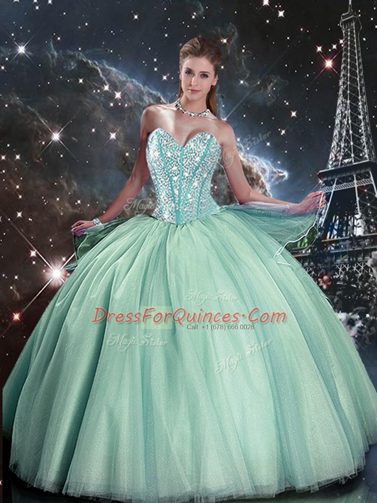 New Style Tulle Sweetheart Sleeveless Lace Up Beading Quince Ball Gowns in Turquoise