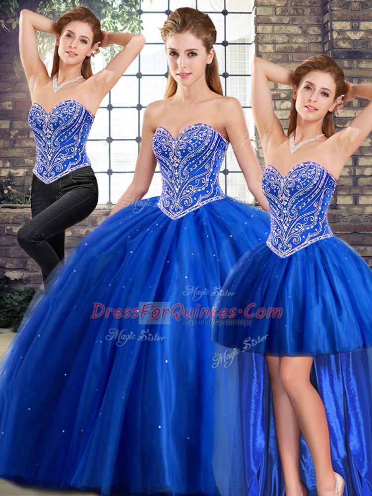 Nice Blue Three Pieces Tulle Sweetheart Sleeveless Beading Lace Up Quinceanera Dresses Brush Train