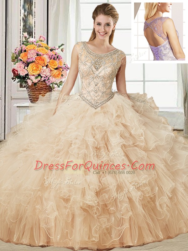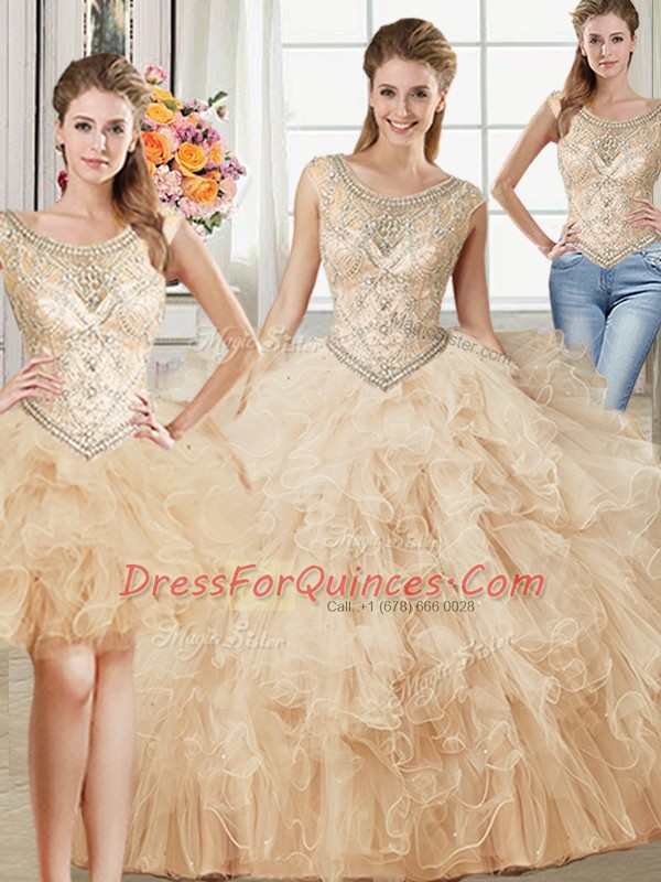 Nice Three Piece Floor Length Champagne Ball Gown Prom Dress Scoop Sleeveless Lace Up