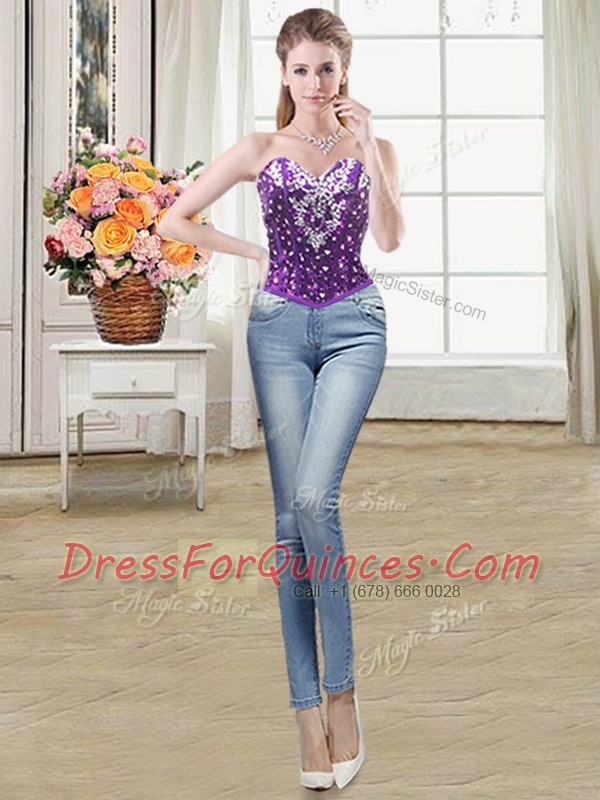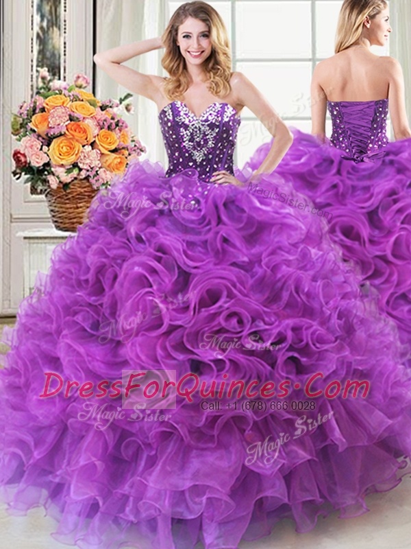 Noble Three Piece Eggplant Purple Sweetheart Lace Up Beading and Ruffles Ball Gown Prom Dress Sleeveless