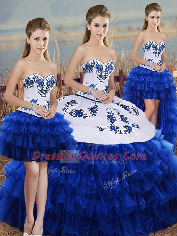 Organza Sweetheart Sleeveless Lace Up Embroidery and Ruffled Layers and Bowknot Quinceanera Gown in Royal Blue