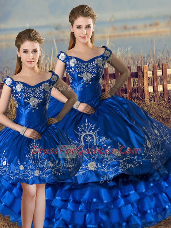 Royal Blue Lace Up Off The Shoulder Embroidery and Ruffled Layers Sweet 16 Quinceanera Dress Satin and Organza Sleeveless