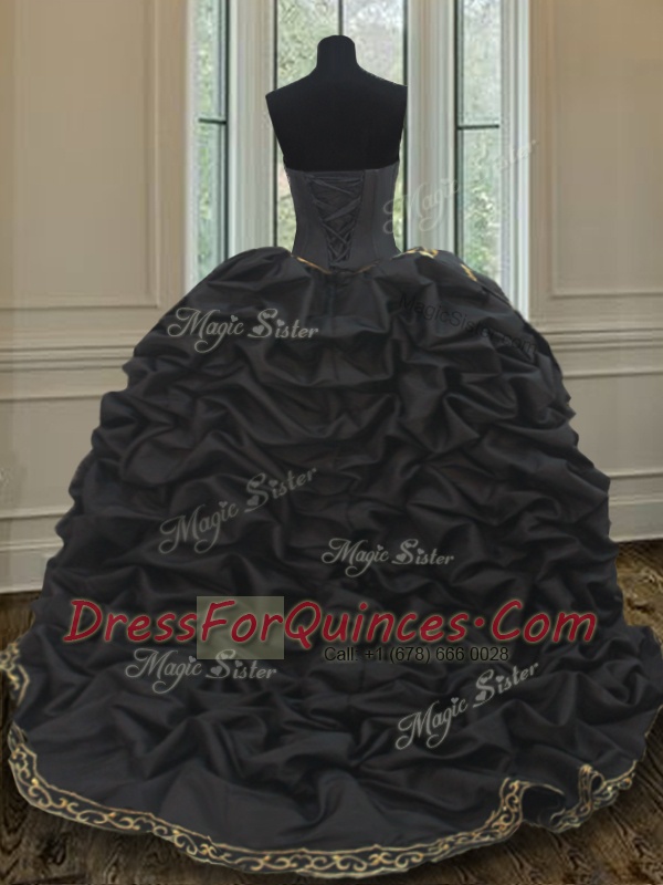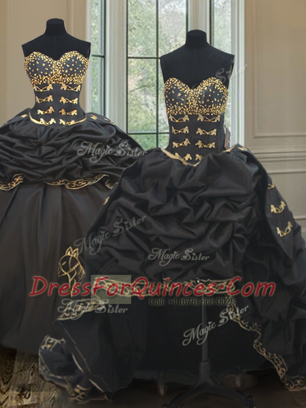 Three Piece Black Taffeta Lace Up Quinceanera Gowns Sleeveless With Brush Train Beading and Embroidery and Pick Ups