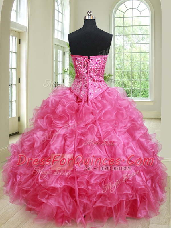 Three Piece Sleeveless Organza Floor Length Lace Up Vestidos de Quinceanera in Hot Pink with Beading and Ruffles