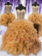 Traditional Four Piece Gold Ball Gowns Organza Sweetheart Sleeveless Beading and Ruffles Floor Length Lace Up Sweet 16 Dress