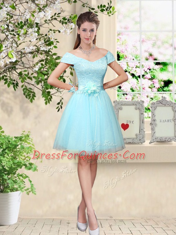 Aqua Blue Lace Up V-neck Lace and Belt Quinceanera Court of Honor Dress Tulle Cap Sleeves
