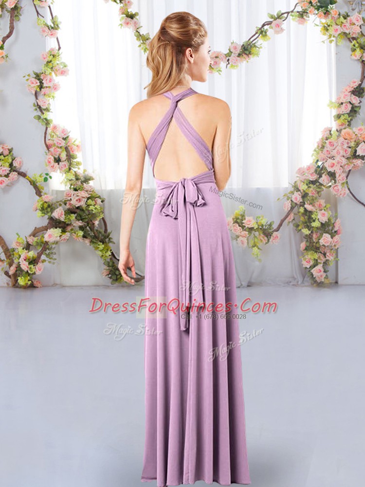 Captivating Halter Top Sleeveless Court Dresses for Sweet 16 Floor Length Ruching Lavender Chiffon