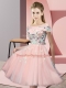 Chic Pink Empire Off The Shoulder Short Sleeves Tulle Knee Length Lace Up Appliques Court Dresses for Sweet 16
