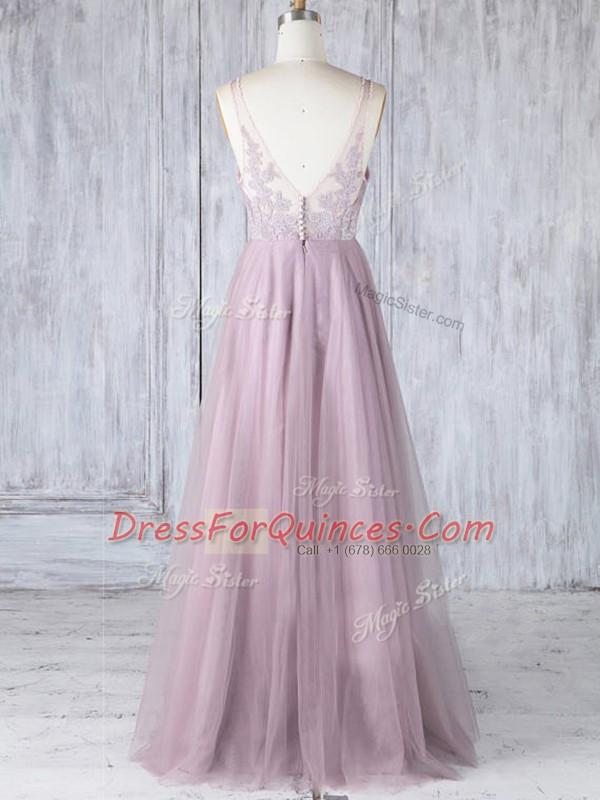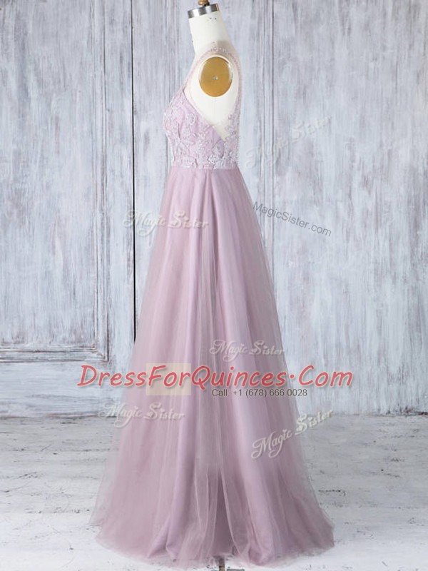Custom Designed Pink Sleeveless Lace Floor Length Dama Dress for Quinceanera