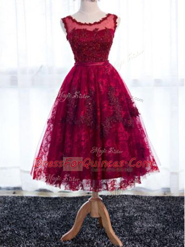 Glamorous Fuchsia Sleeveless Tea Length Lace Zipper Court Dresses for Sweet 16