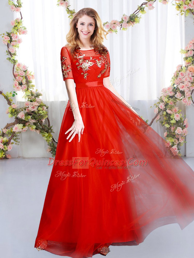 Graceful Empire Quinceanera Dama Dress Red Scoop Tulle Short Sleeves Floor Length Zipper