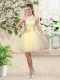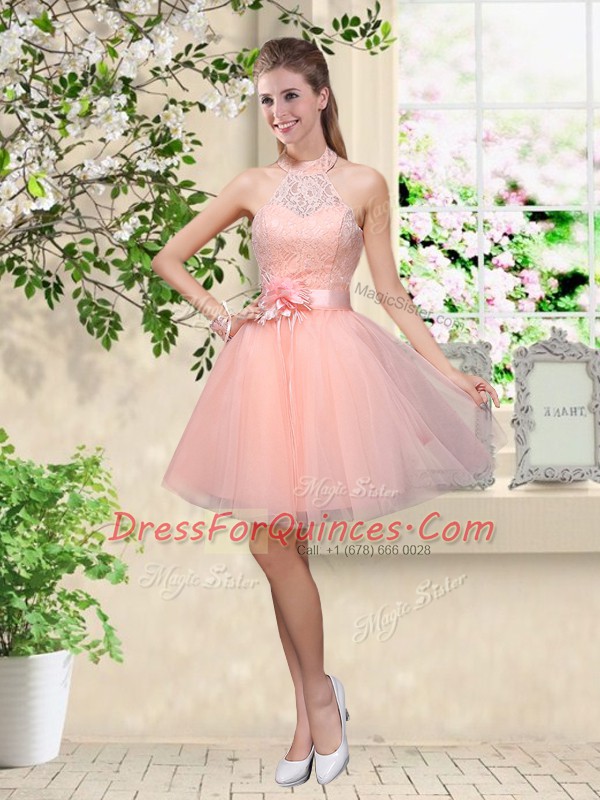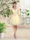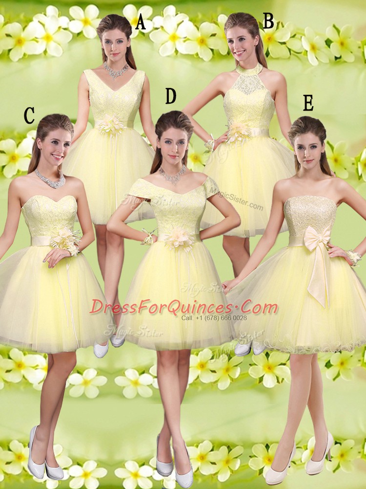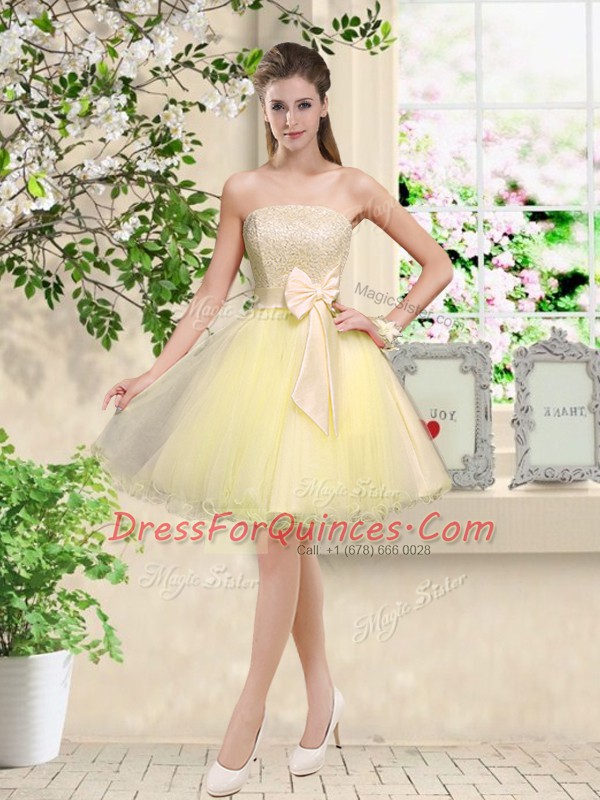 Light Yellow A-line Lace and Belt Dama Dress Lace Up Tulle Sleeveless Knee Length