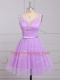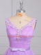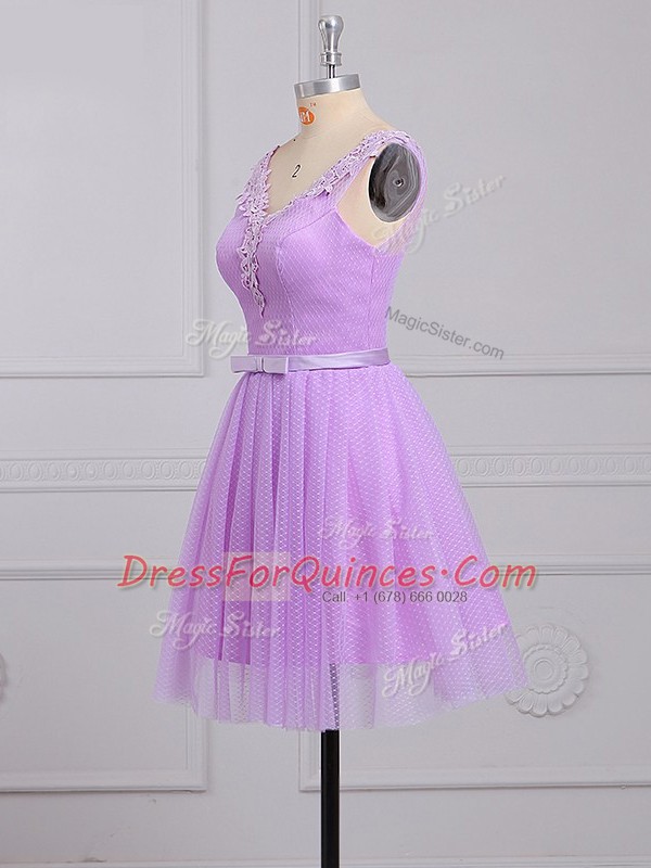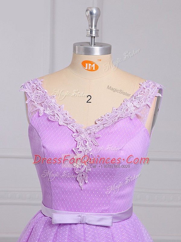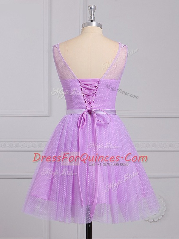Luxurious Appliques and Belt Dama Dress Lilac Lace Up Sleeveless Mini Length