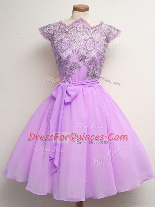 Luxurious Lilac Cap Sleeves Chiffon Lace Up Quinceanera Dama Dress for Prom and Party and Wedding Party