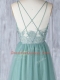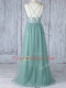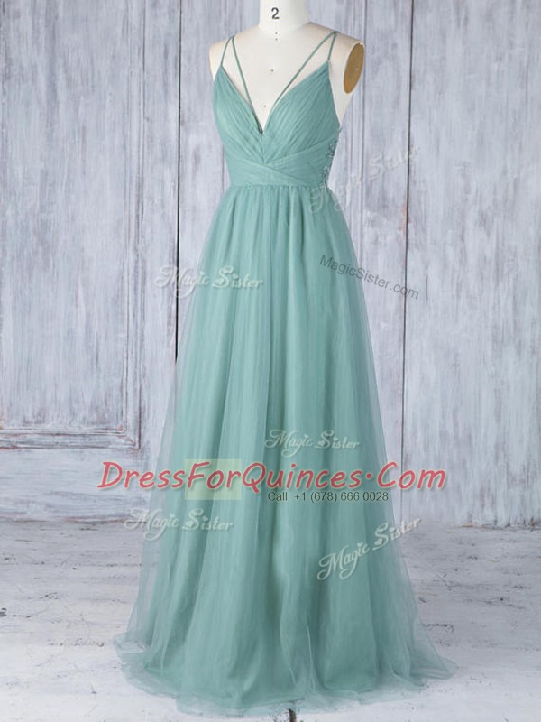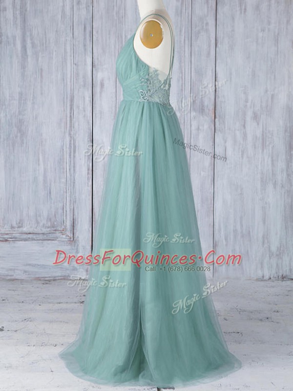 Luxury Sleeveless Tulle Floor Length Criss Cross Dama Dress in Green with Appliques